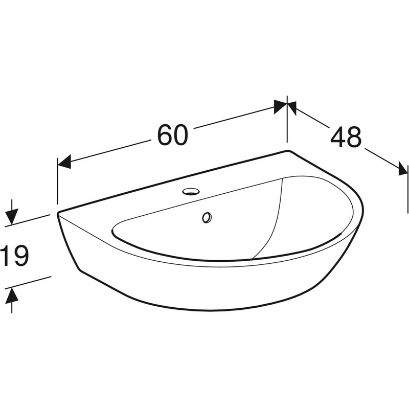 Geberit Renova -pesuallas: B = 60 cm, T = 48 cm, hanareikä = keskellä, ylivuoto = näkyvä, valkoinen.