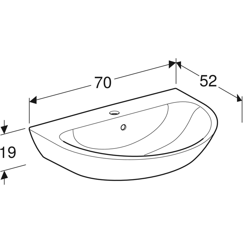 Geberit Renova -pesuallas: B = 70 cm, T = 52 cm, hanareikä = keskellä, ylivuoto = näkyvä, valkoinen.