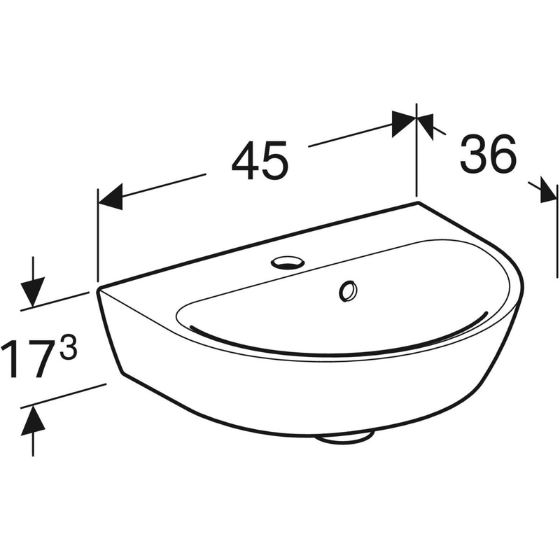 Geberit Renova -pesuallas, epäsymmetrinen ylivuotoaukko: valkoinen / KeraTect, B = 45 cm, H = 17.3 cm, T = 36 cm, hanareikä = keskellä, ylivuoto = näkyvä.