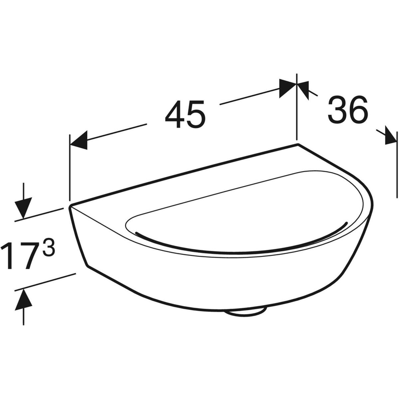 Geberit Renova -pesuallas, epäsymmetrinen ylivuotoaukko: valkoinen / KeraTect, B = 45 cm, H = 17.3 cm, T = 36 cm, hanareikä = ei ole, ylivuoto = ei ole.