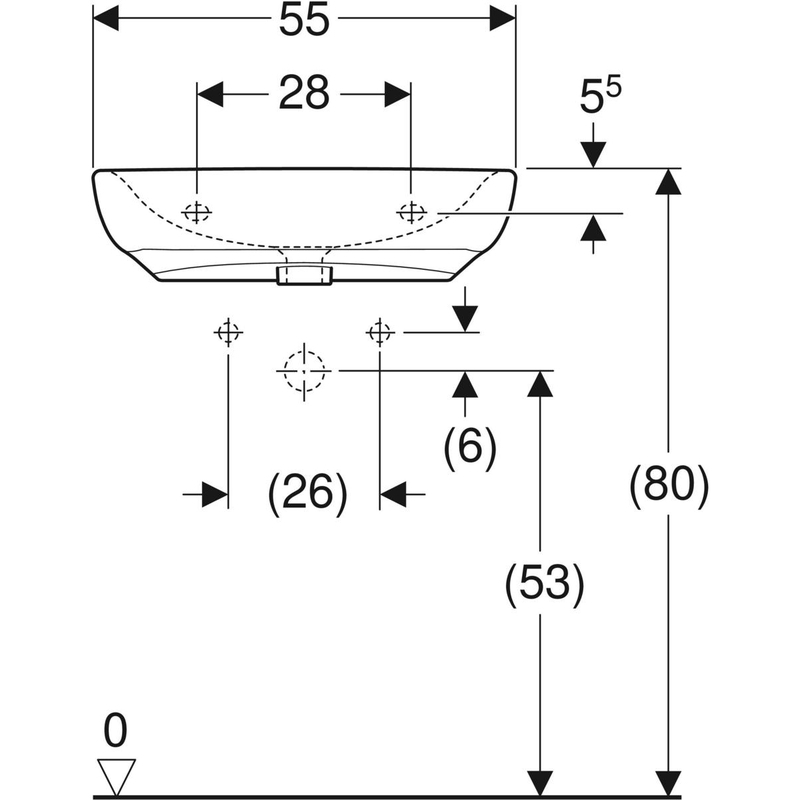 Valkoinen Geberit Renova Comfort -pesuallas, esteetön: B = 55 cm, T = 55 cm, hanareikä = ei ole, ylivuoto = ei ole.