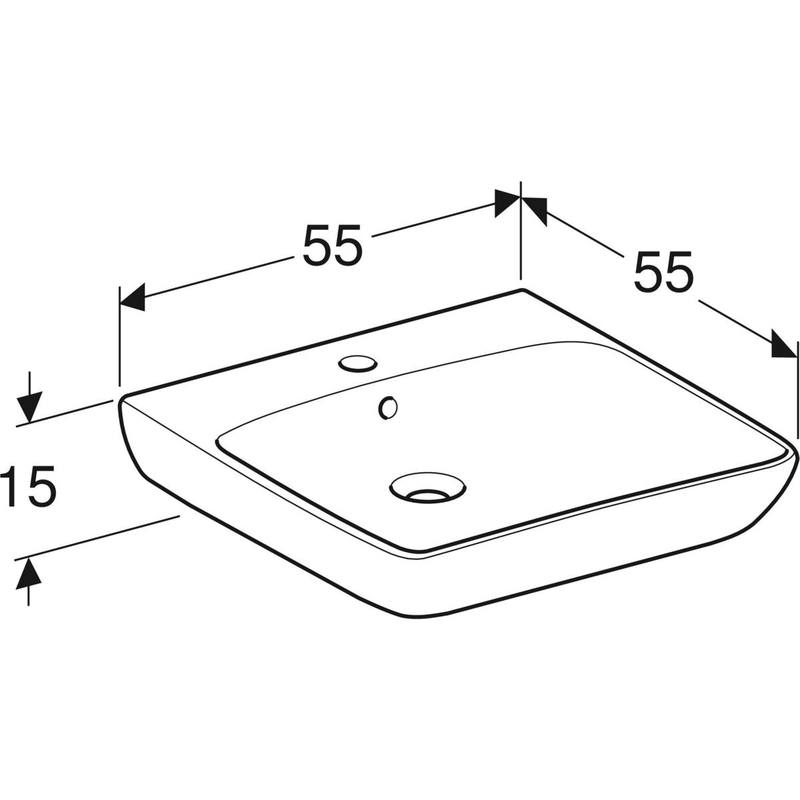 Geberit Renova Comfort -pesuallas, esteetön: B = 55 cm, T = 55 cm, hanareikä = keskellä, ylivuoto = näkyvä. Valkoinen/ KeraTect.