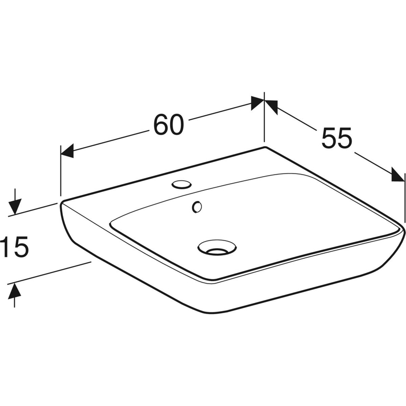 Geberit Renova Comfort -pesuallas, esteetön: B = 60 cm, T = 55 cm, hanareikä = keskellä, ylivuoto = näkyvä, valkoinen.