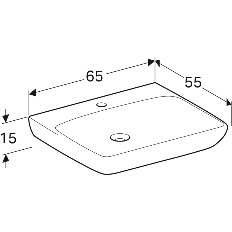 Valkoinen Geberit Renova Comfort -pesuallas, esteetön: B = 65 cm, T = 55 cm, hanareikä = keskellä, ylivuoto = ei ole.