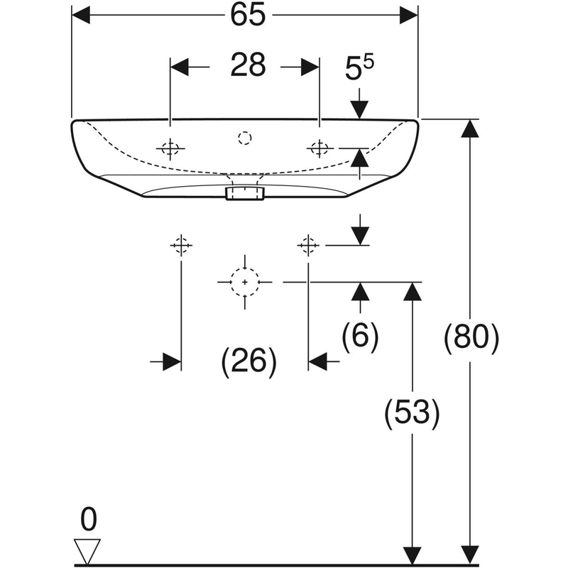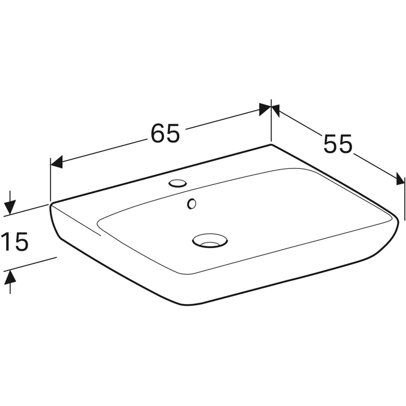 Valkoinen Geberit Renova Comfort -pesuallas, esteetön: B = 65 cm, T = 55 cm, hanareikä = keskellä, ylivuoto = näkyvä. Valkoinen/ KeraTect.