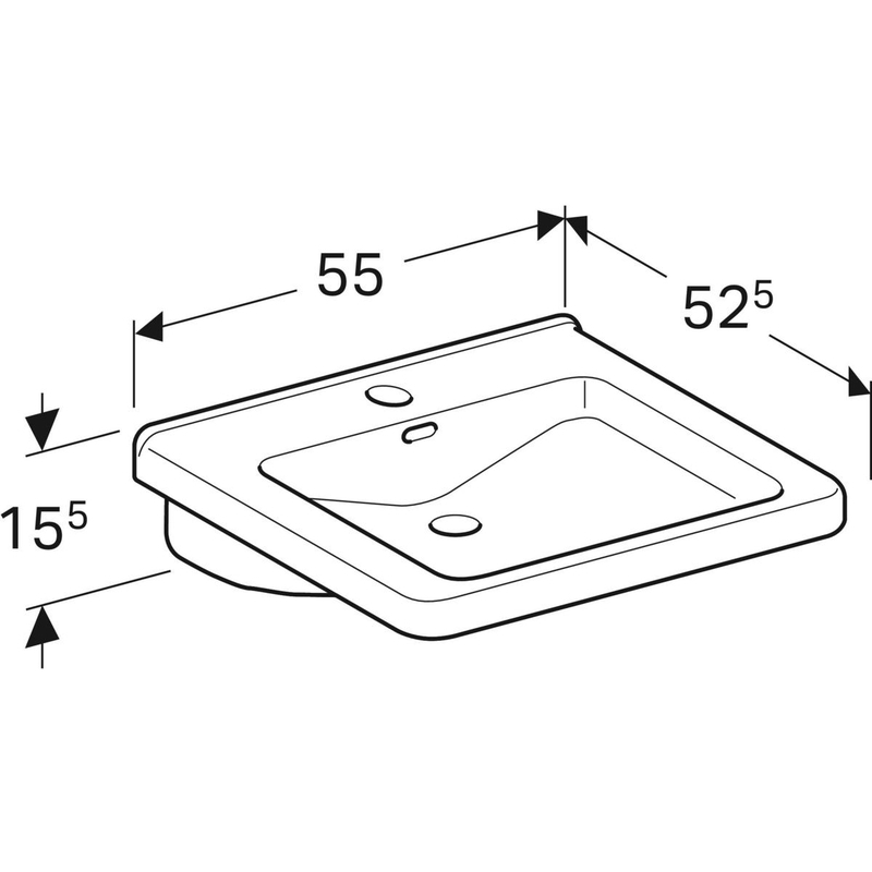 Geberit Renova Comfort Square -pesuallas, esteetön: B = 55 cm, T = 52.5 cm, hanareikä = keskellä, ylivuoto = näkyvä, valkoinen.