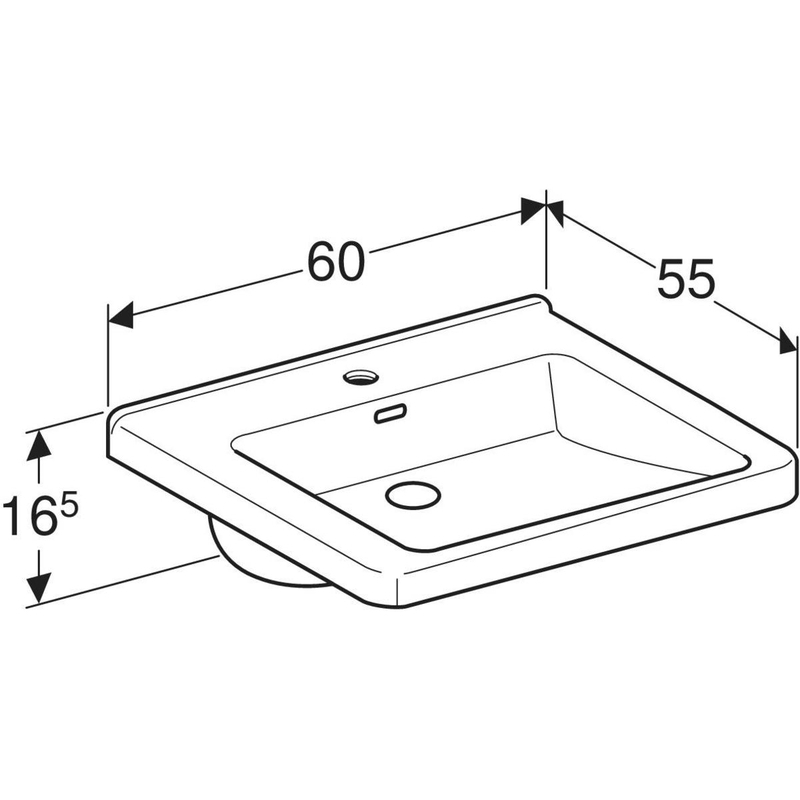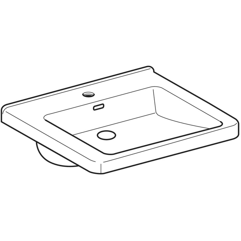 Geberit Renova Comfort Square -pesuallas, esteetön: B = 60 cm, T = 55 cm, hanareikä = ei ole, ylivuoto = näkyvä, valkoinen.