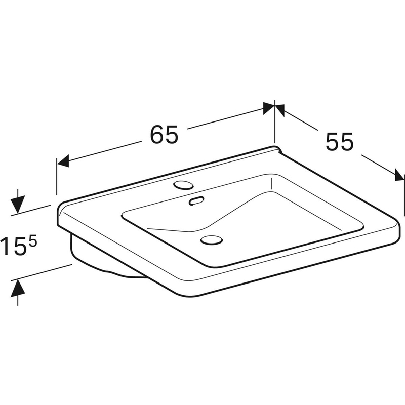 Geberit Renova Comfort Square -pesuallas, esteetön: B = 65 cm, T = 55 cm, hanareikä = keskellä, ylivuoto = näkyvä, valkoinen.