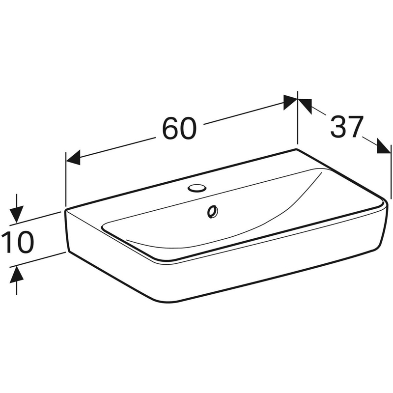 Geberit Renova Compact -pesuallas: B = 60 cm, T = 37 cm, hanareikä = keskellä, ylivuoto = näkyvä, valkoinen.