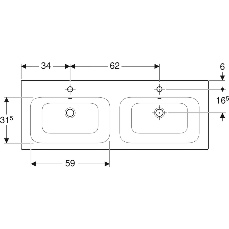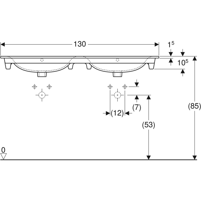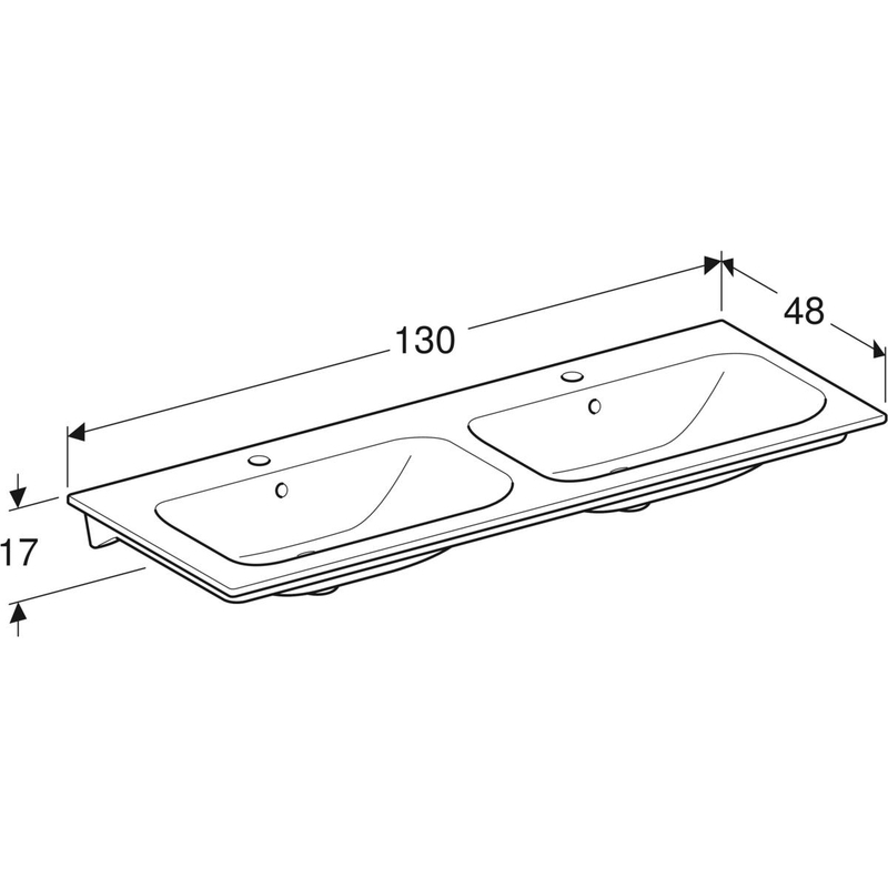 Geberit Renova Plan -kaksoistasoallas: B = 130 cm, T = 48 cm, hanareikä = keskellä, ylivuoto = näkyvä, valkoinen.
