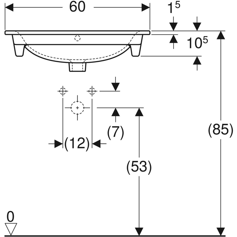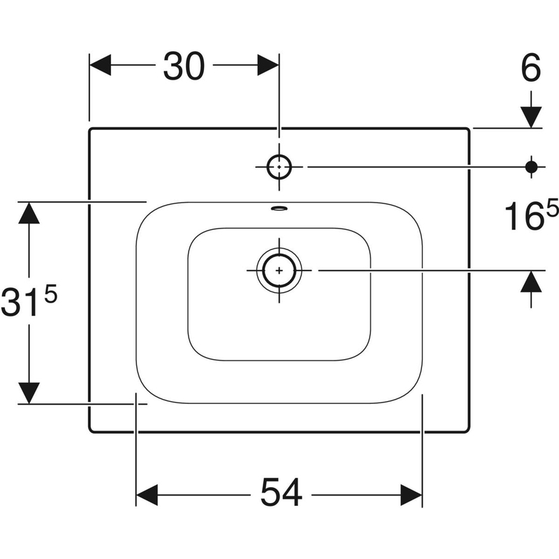 Geberit Renova Plan -tasoallas: B = 60 cm, T = 48 cm, hanareikä = keskellä, ylivuoto = näkyvä, valkoinen / KeraTect.