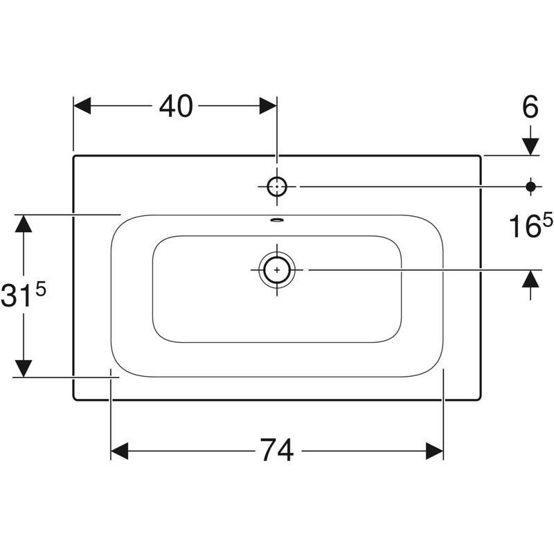 Geberit Renova Plan -tasoallas: B = 80 cm, T = 48 cm, hanareikä = keskellä, ylivuoto = näkyvä, valkoinen / KeraTect.