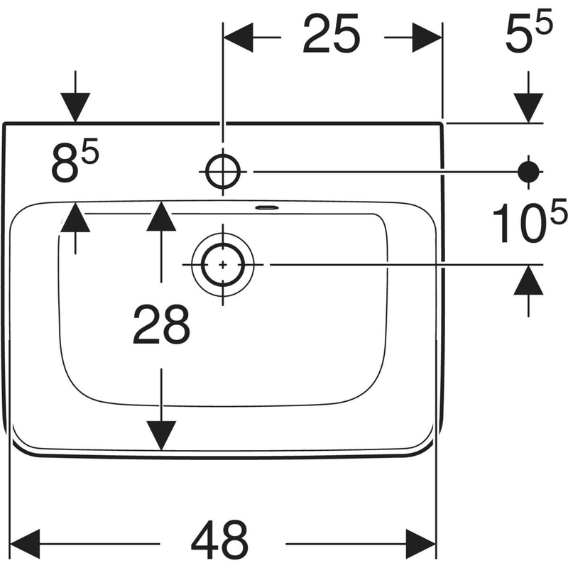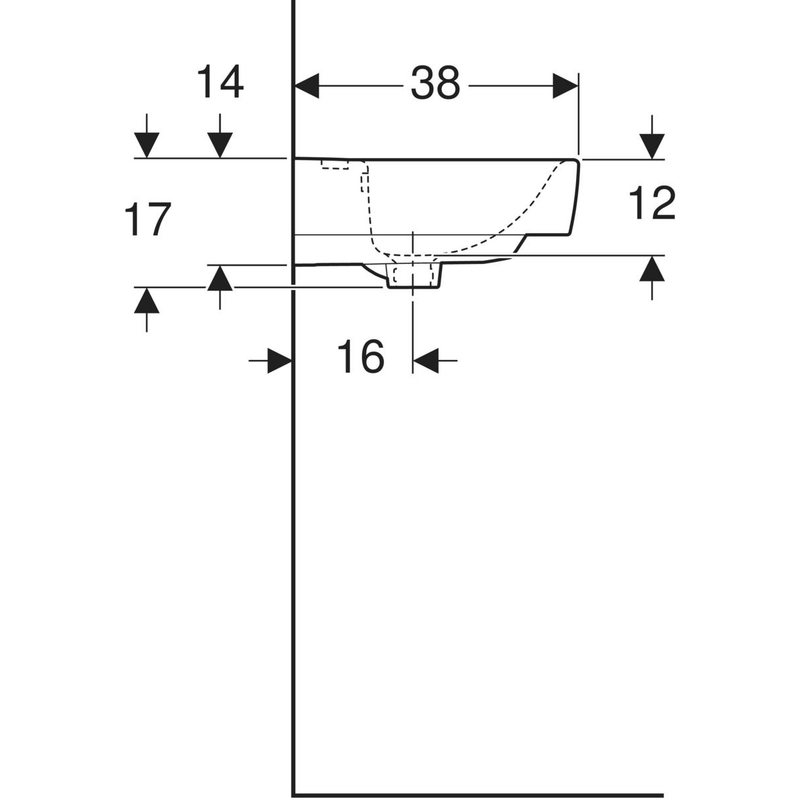 Geberit Renova Plan -pieni pesuallas, epäsymmetrinen ylivuotoaukko: valkoinen / KeraTect, B = 50 cm, H = 16.5 cm, T = 38 cm, hanareikä = keskellä, ylivuoto = näkyvä.