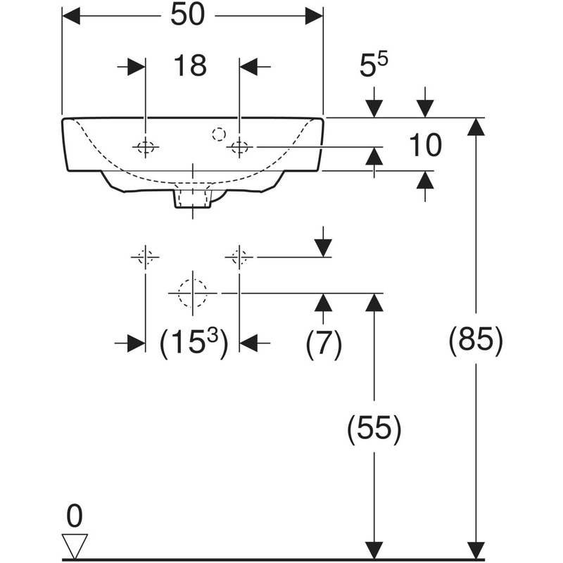 Geberit Renova Plan -pieni pesuallas, epäsymmetrinen ylivuotoaukko: valkoinen, B = 50 cm, H = 16.5 cm, T = 38 cm, hanareikä = ei ole, ylivuoto = näkyvä.