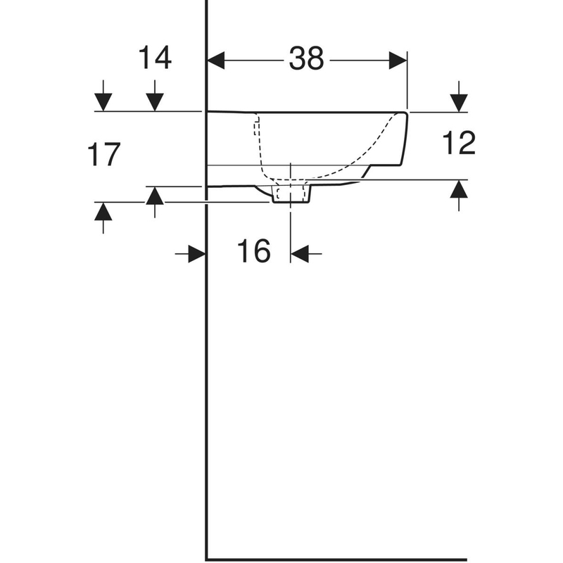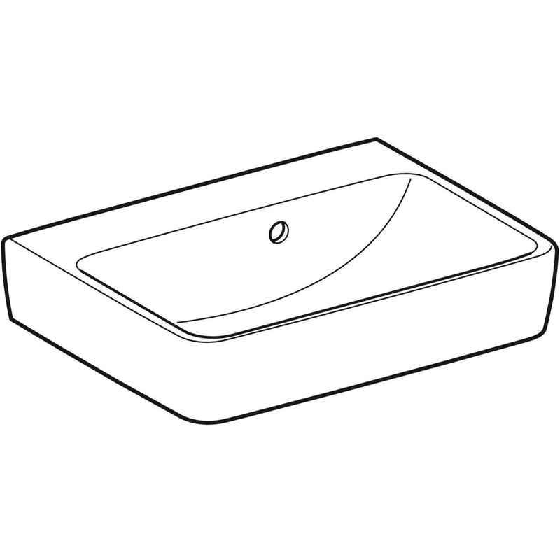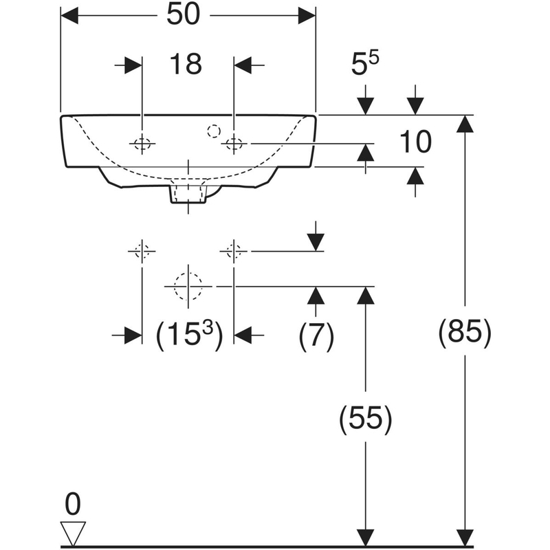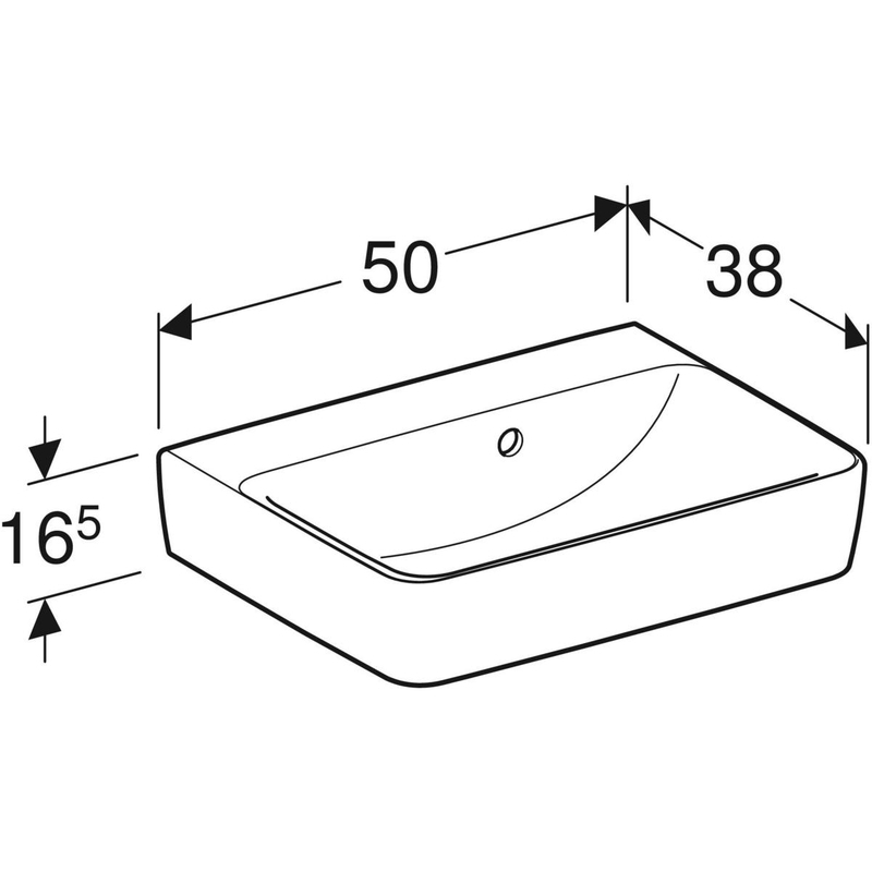 Geberit Renova Plan -pieni pesuallas, epäsymmetrinen ylivuotoaukko: valkoinen / KeraTect, B = 50 cm, H = 16.5 cm, T = 38 cm, hanareikä = ei ole, ylivuoto = näkyvä.