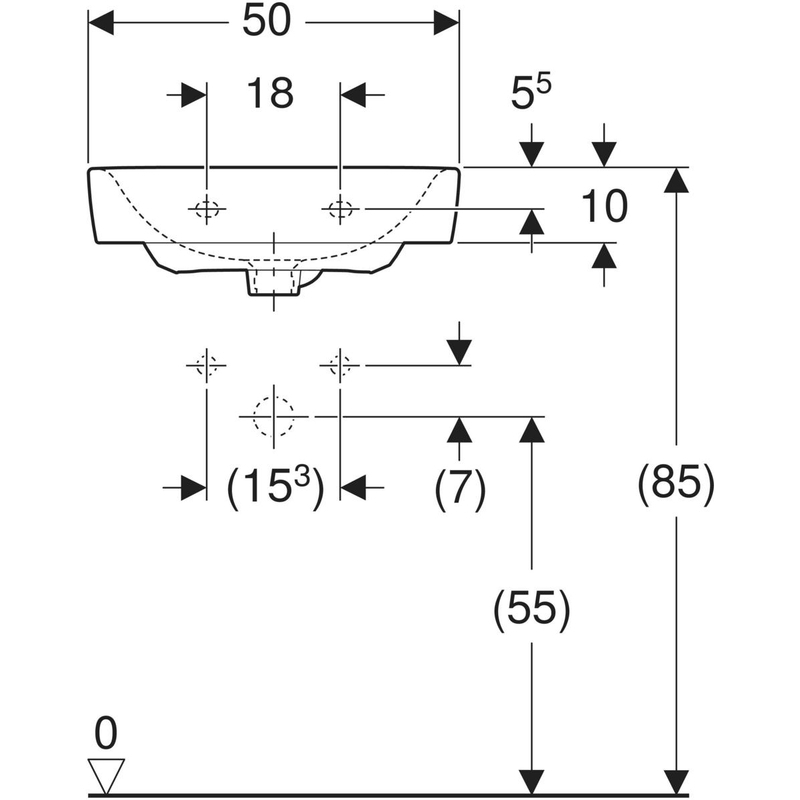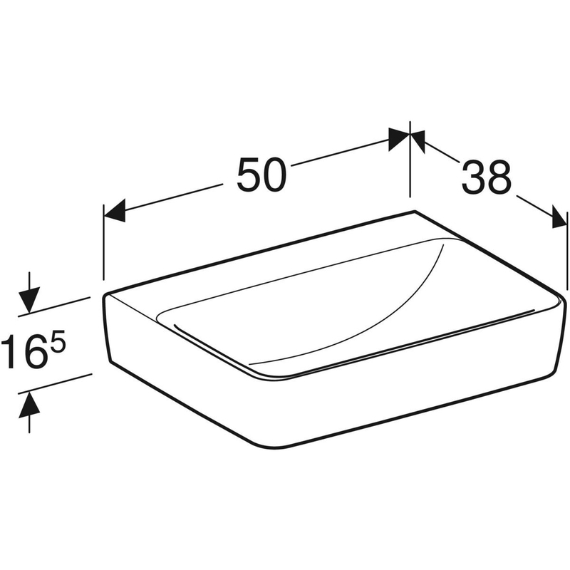 Geberit Renova Plan -pieni pesuallas, epäsymmetrinen ylivuotoaukko: valkoinen / KeraTect, B = 50 cm, H = 16.5 cm, T = 38 cm, hanareikä = ei ole, ylivuoto = ei ole.