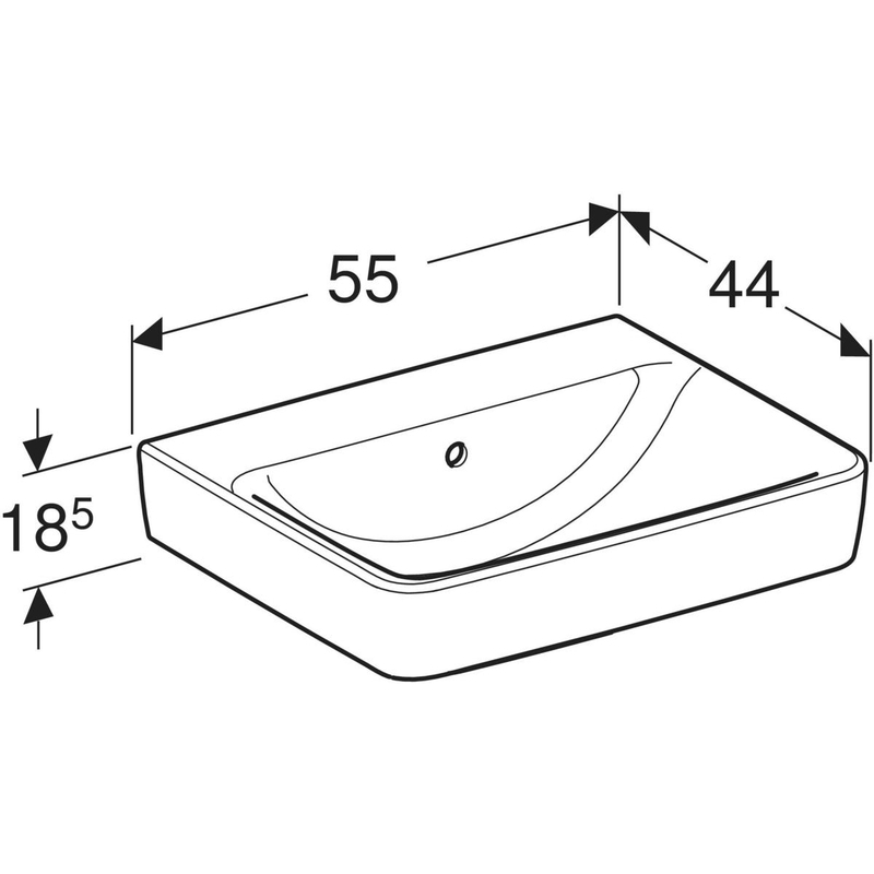 Geberit Renova Plan -pesuallas: B = 55 cm, T = 44 cm, hanareikä = ei ole, ylivuoto = näkyvä, valkoinen.