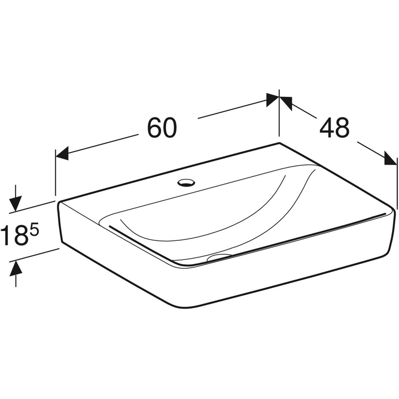 Geberit Renova Plan -pesuallas: B = 60 cm, T = 48 cm, hanareikä = keskellä, ylivuoto = ei ole, valkoinen / KeraTect.