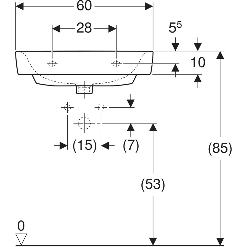 Geberit Renova Plan -pesuallas: B = 60 cm, T = 48 cm, hanareikä = ei ole, ylivuoto = ei ole, valkoinen / KeraTect.