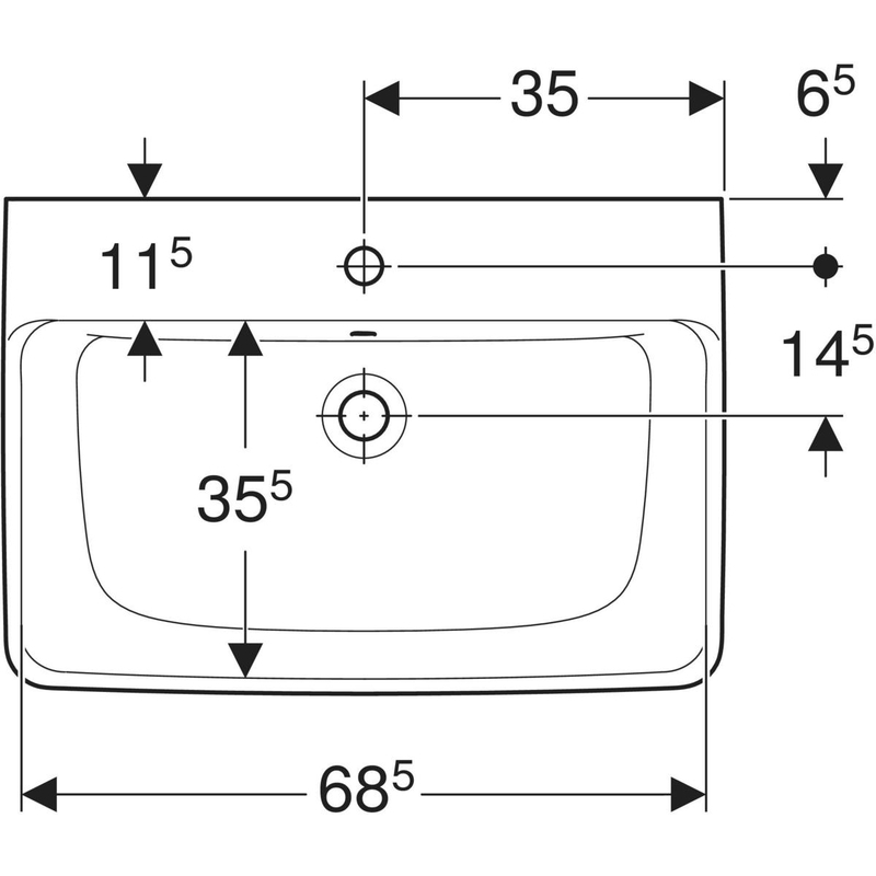 Geberit Renova Plan -pesuallas: B = 70 cm, T = 48 cm, hanareikä = keskellä, ylivuoto = näkyvä, valkoinen / KeraTect.