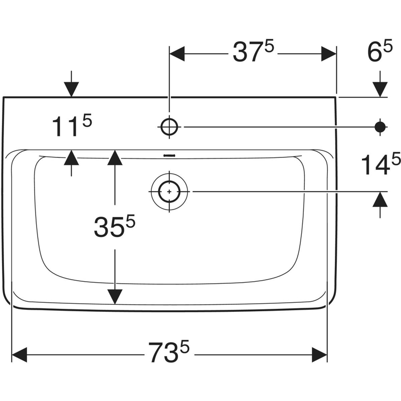 Geberit Renova Plan -pesuallas: B = 75 cm, T = 48 cm, hanareikä = keskellä, ylivuoto = näkyvä, valkoinen / KeraTect.