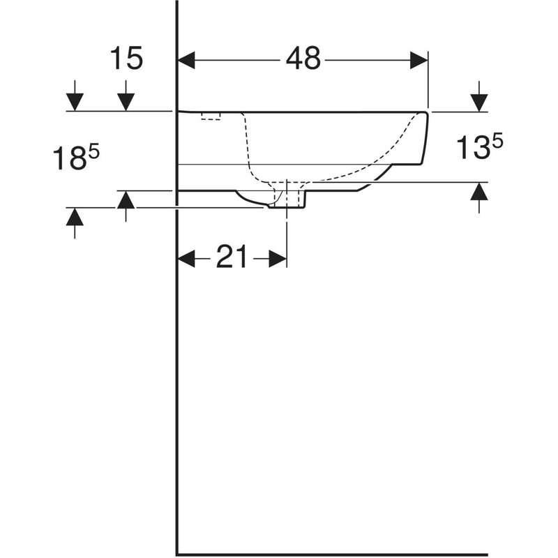 Geberit Renova Plan -pesuallas laskutasolla: B = 75 cm, T = 48 cm, hanareikä = keskellä, ylivuoto = ei ole, laskutaso = molemmin puolin, valkoinen / KeraTect.