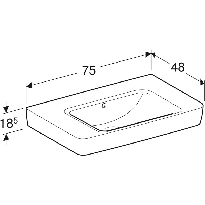 Geberit Renova Plan -pesuallas laskutasolla: B = 75 cm, T = 48 cm, hanareikä = ei ole, ylivuoto = näkyvä, laskutaso = molemmin puolin, valkoinen.