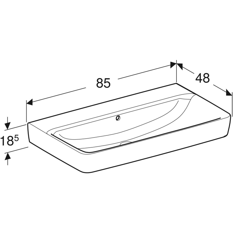 Geberit Renova Plan -pesuallas: B = 85 cm, T = 48 cm, hanareikä = ei ole, ylivuoto = näkyvä, valkoinen.