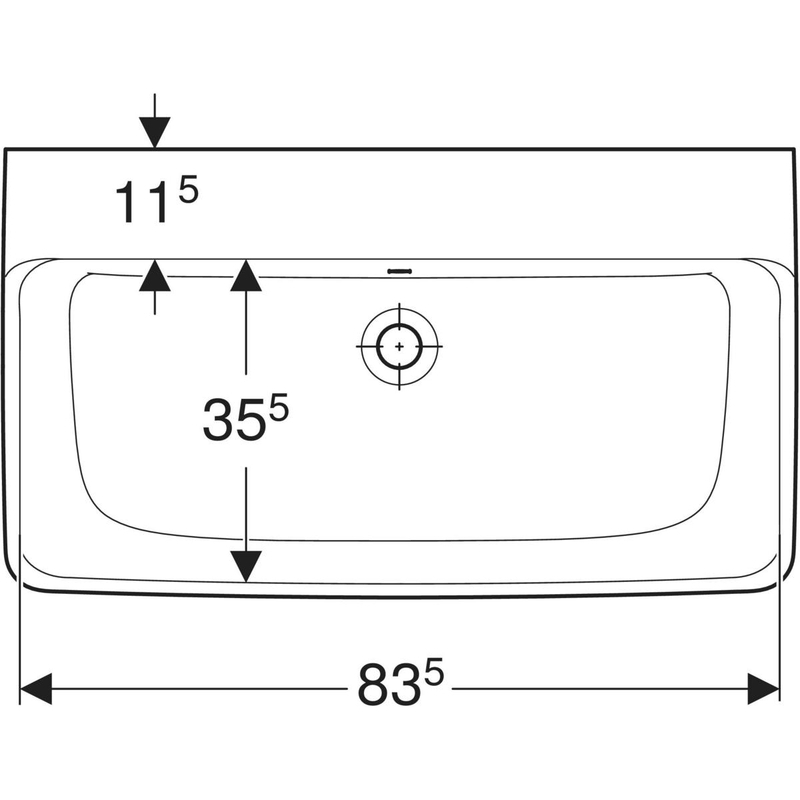 Geberit Renova Plan -pesuallas: B = 85 cm, T = 48 cm, hanareikä = ei ole, ylivuoto = näkyvä, valkoinen / KeraTect.