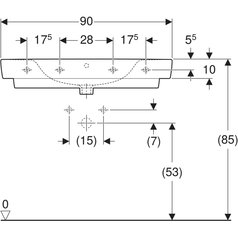 Geberit Renova Plan -pesuallas laskutasolla: B = 90 cm, T = 48 cm, hanareikä = keskellä, ylivuoto = näkyvä, laskutaso = molemmin puolin, valkoinen.