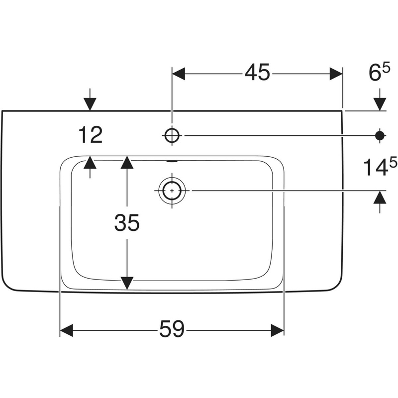 Geberit Renova Plan -pesuallas laskutasolla: B = 90 cm, T = 48 cm, hanareikä = keskellä, ylivuoto = näkyvä, laskutaso = molemmin puolin, valkoinen / KeraTect.