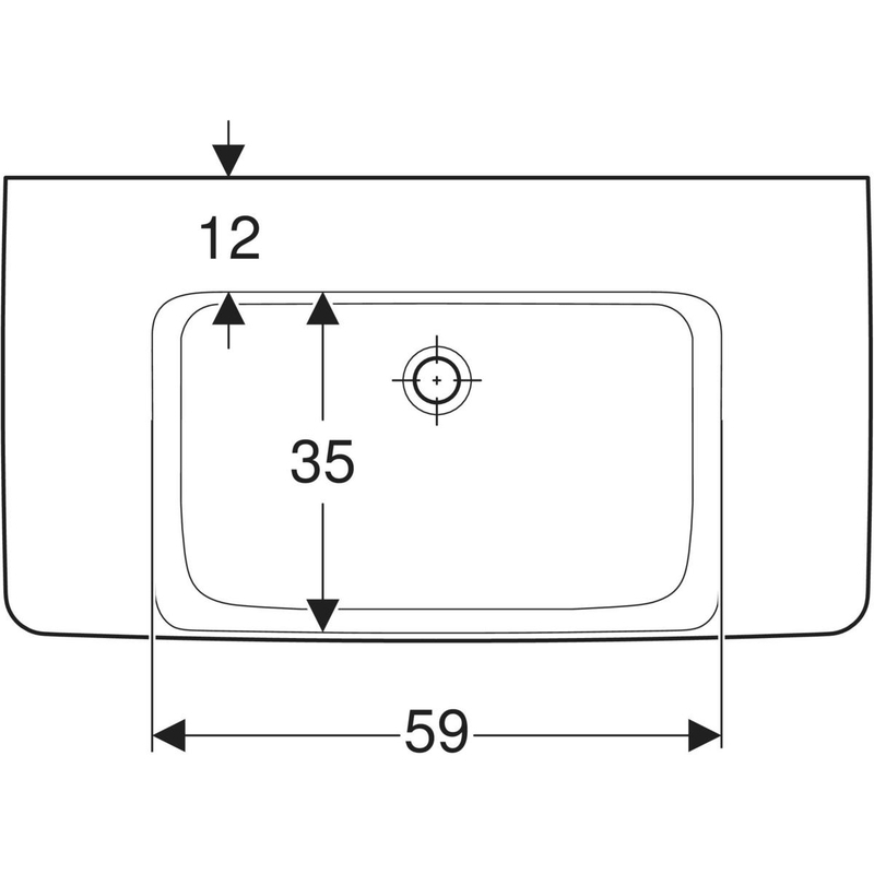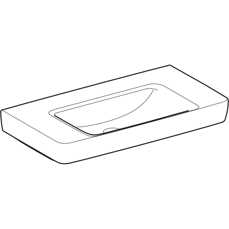 Geberit Renova Plan -pesuallas laskutasolla: B = 90 cm, T = 48 cm, hanareikä = ei ole, ylivuoto = ei ole, laskutaso = molemmin puolin, valkoinen.
