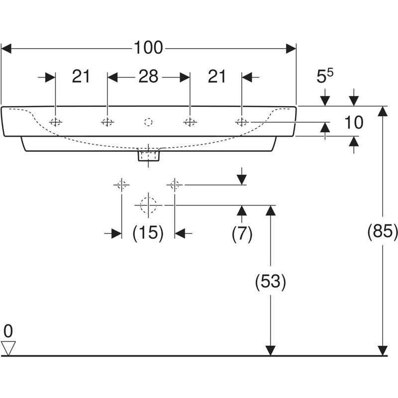 Geberit Renova Plan -pesuallas: B = 100 cm, T = 48 cm, hanareikä = keskellä, ylivuoto = näkyvä, valkoinen.