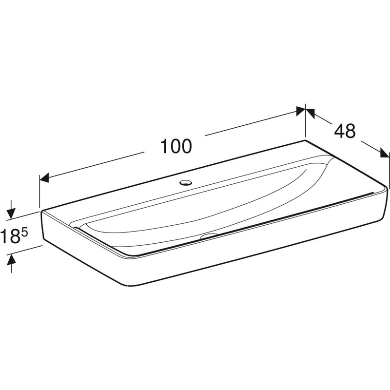 Geberit Renova Plan -pesuallas: B = 100 cm, T = 48 cm, hanareikä = keskellä, ylivuoto = ei ole, valkoinen.