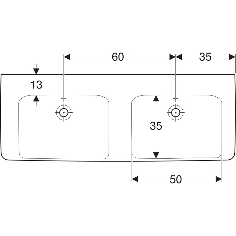 Geberit Renova Plan -kaksoispesuallas: B = 130 cm, T = 48 cm, hanareikä = ei ole, ylivuoto = näkyvä, valkoinen / KeraTect.