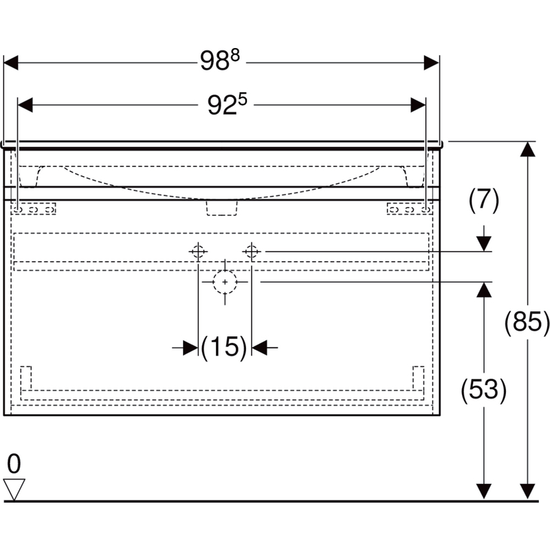 Geberit Renova Plan -allaskaappipaketti, Slim Rim, yhdellä laatikolla ja yhdellä sisälaatikolla: B = 98.8 cm, H = 62.2 cm, T = 48 cm, pesualtaan leveys = 100 cm. Hikkoripuu / kalvo strukturoitu, valkoinen.