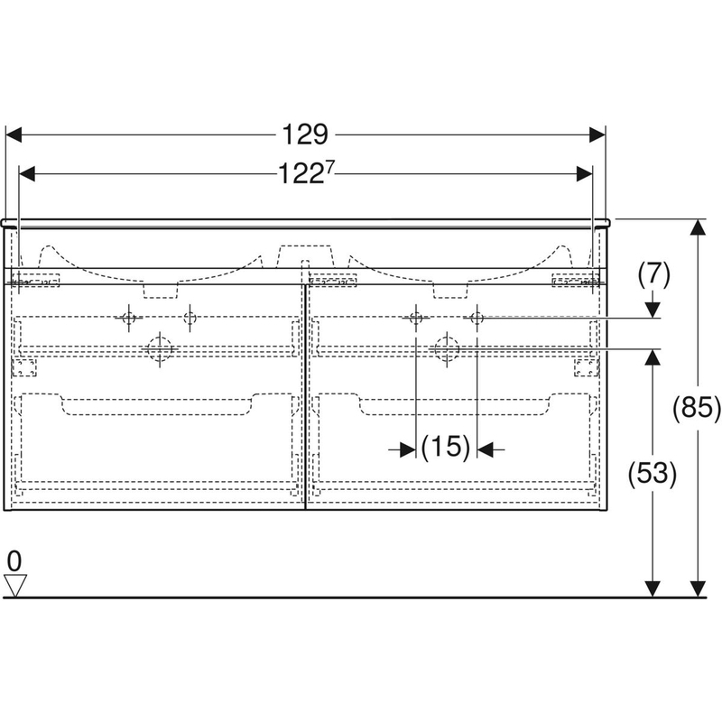 Geberit Renova Plan -kaksoisallaskaappipaketti, Slim Rim, kahdella laatikolla ja kahdella sisälaatikolla: B = 130 cm, H = 62.2 cm, T = 48 cm, pesualtaan leveys = 130 cm. Hikkoripuu vaalea / kalvo strukturoitu, valkoinen / KeraTect.