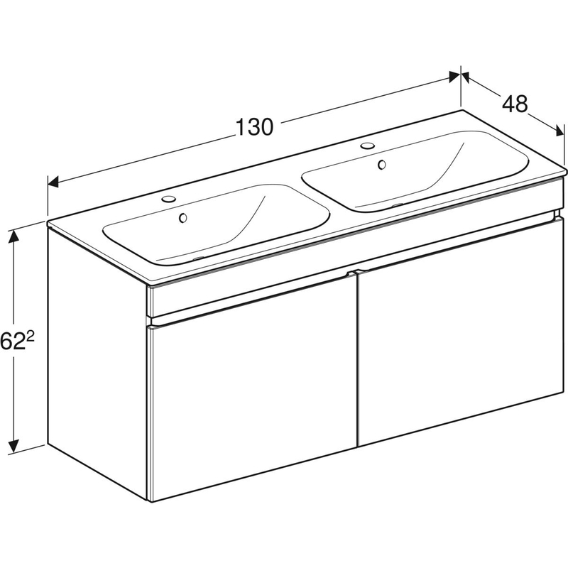 Geberit Renova Plan -kaksoisallaskaappipaketti, Slim Rim, kahdella laatikolla ja kahdella sisälaatikolla: B = 130 cm, H = 62.2 cm, T = 48 cm, pesualtaan leveys = 130 cm. Valkoinen/lakattu korkeakiilto, valkoinen.
