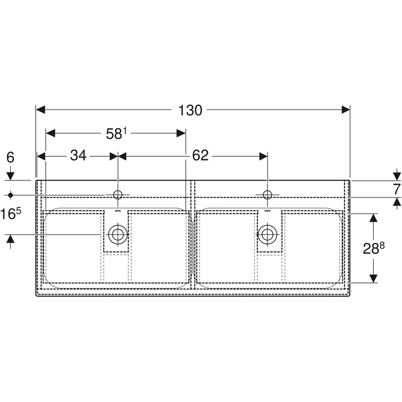Geberit Renova Plan -kaksoisallaskaappipaketti, Slim Rim, kahdella laatikolla ja kahdella sisälaatikolla: B = 130 cm, H = 62.2 cm, T = 48 cm, pesualtaan leveys = 130 cm. Laava/lakattu matta, valkoinen/KeraTect.