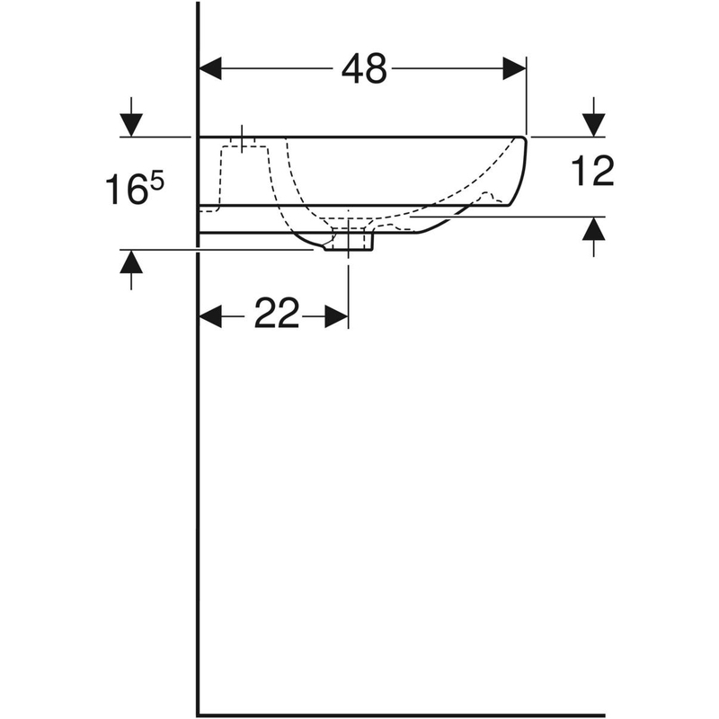 Geberit Smyle -pesuallas: B = 55 cm, T = 48 cm, hanareikä = keskellä, ylivuoto = näkyvä, valkoinen.