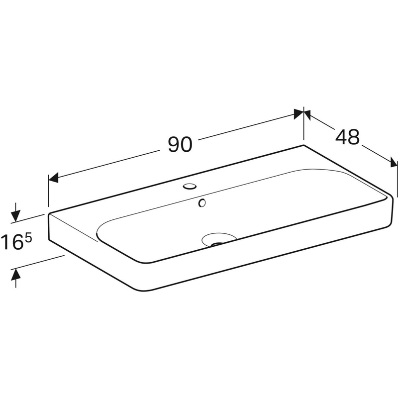 Geberit Smyle Square -pesuallas: B = 90 cm, T = 48 cm, hanareikä = keskellä, ylivuoto = näkyvä, valkoinen.