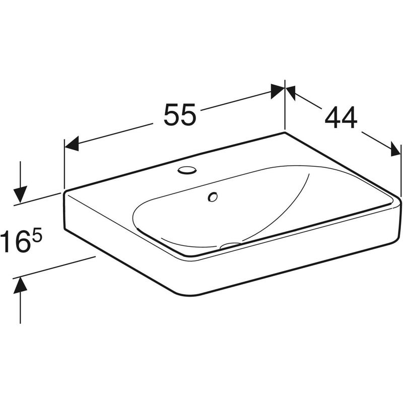 Geberit Smyle Square -pesuallas: B = 55 cm, T = 44 cm, hanareikä = keskellä, ylivuoto = näkyvä, valkoinen.