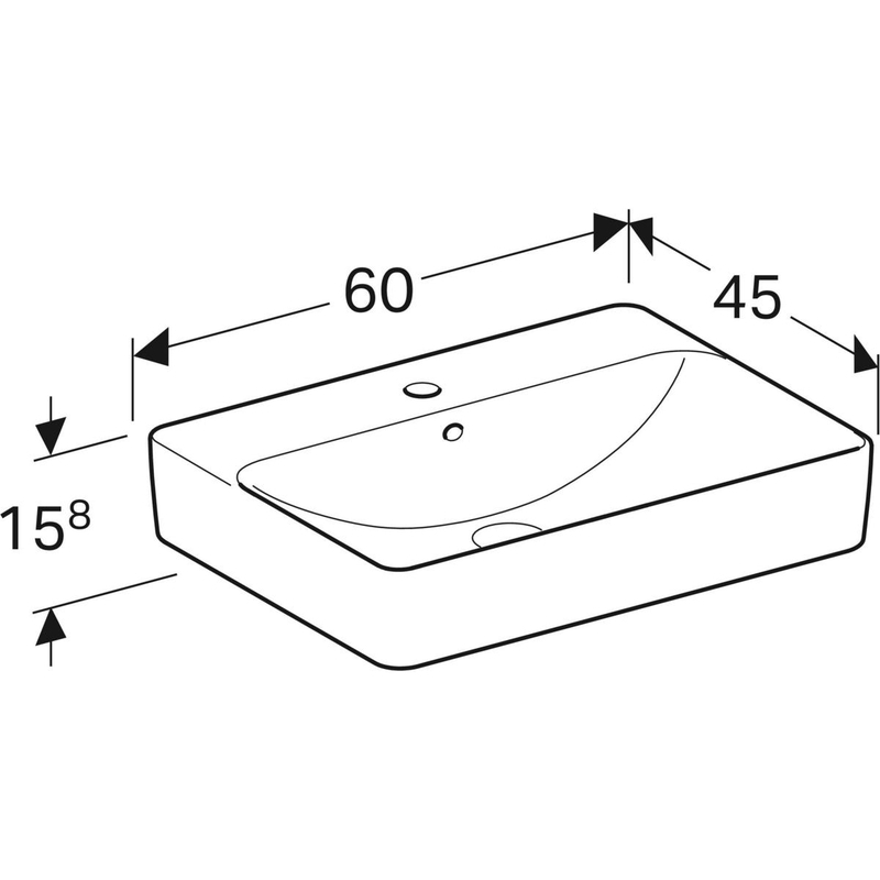 Geberit VariForm -tason päälle asennettava pesuallas, suorakulmainen, hanasaarekkeella: B = 60 cm, T = 45 cm, hanareikä = keskellä, ylivuoto = näkyvä, valkoinen.