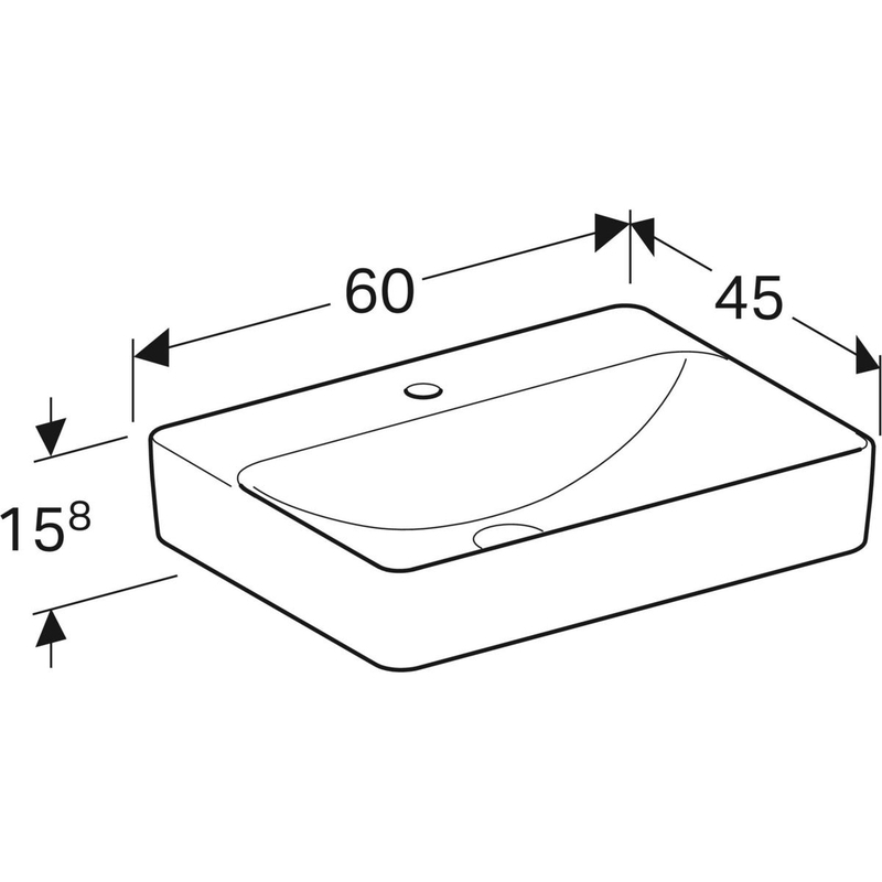 Geberit VariForm -tason päälle asennettava pesuallas, suorakulmainen, hanasaarekkeella: B = 60 cm, T = 45 cm, hanareikä = keskellä, ylivuoto = ei ole, valkoinen.