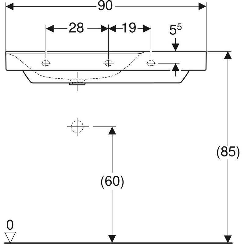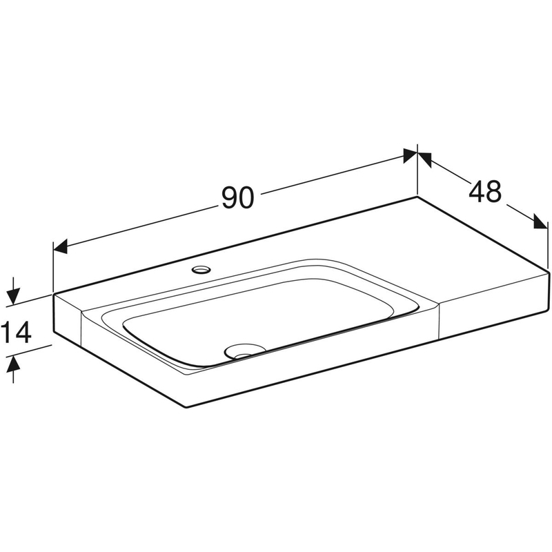 Geberit Xeno² -pesuallas laskutasolla: B = 90 cm, T = 48 cm, hanareikä = keskellä, ylivuoto = ei ole, laskutaso = oikea, valkoinen/ KeraTect.