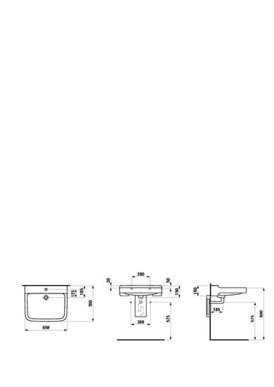 Inva-allas 65 x 55 x 15,5 cm, altaan sisämitta 59,5 x 40 cm. Hanareikä keskellä, ylivuoto kokonaan lasitettu. Valkoinen saniteettiposliini DIN 18040, EN 31.