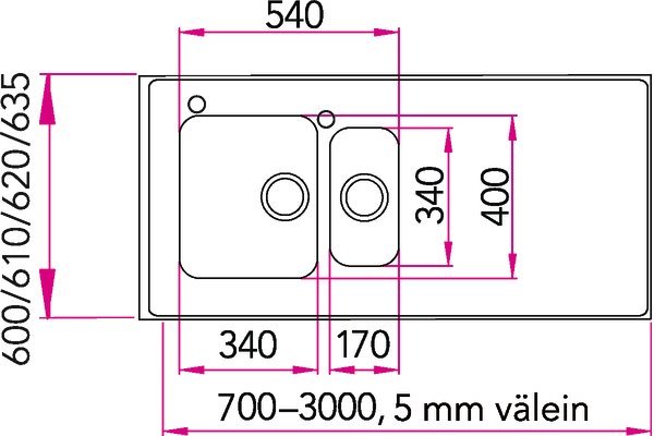 - tason syvyydet 590, 600, 610, 620 tai 635 mm