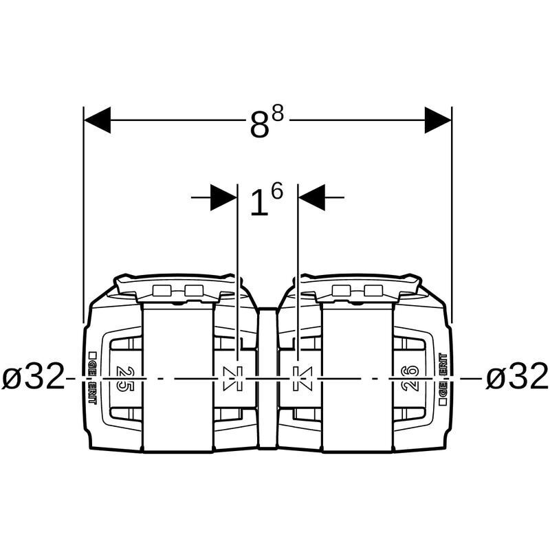 Geberit FlowFit -muunnoskappale Geberit Mepla -järjestelmään: CuZn21Si3P, d = 32 mm, d1 = 32 mm.
