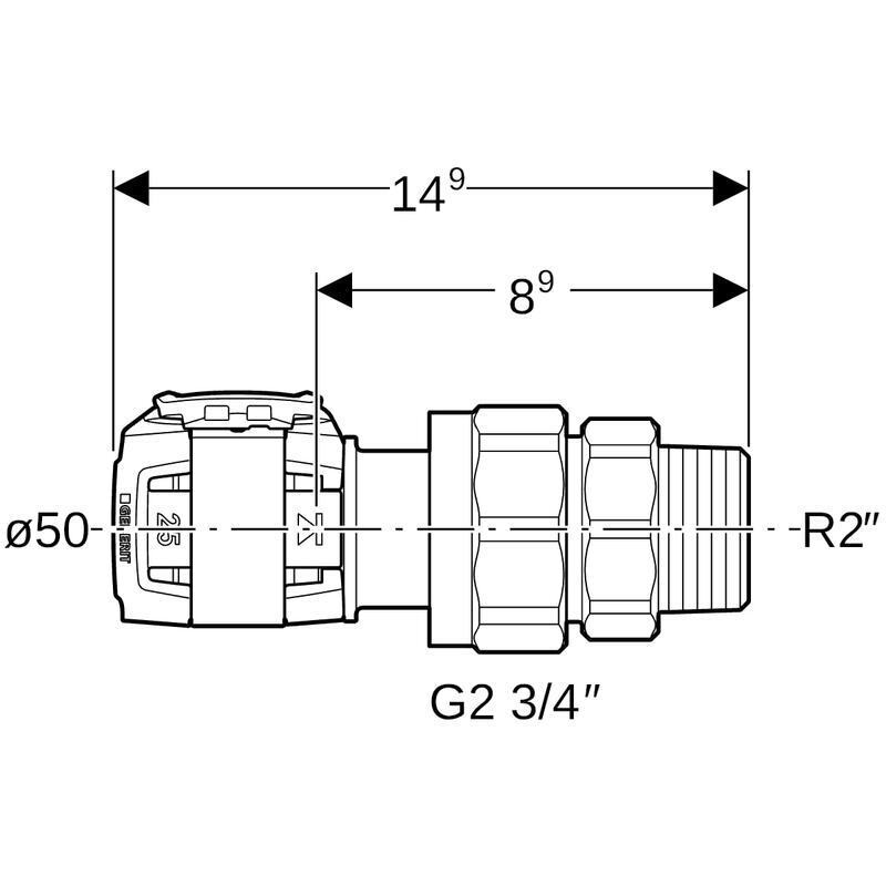 Geberit FlowFit -yhdistäjä ulkokierteellä: CuZn21Si3P, d = 50 mm, R = 2", G = 2 3/4".