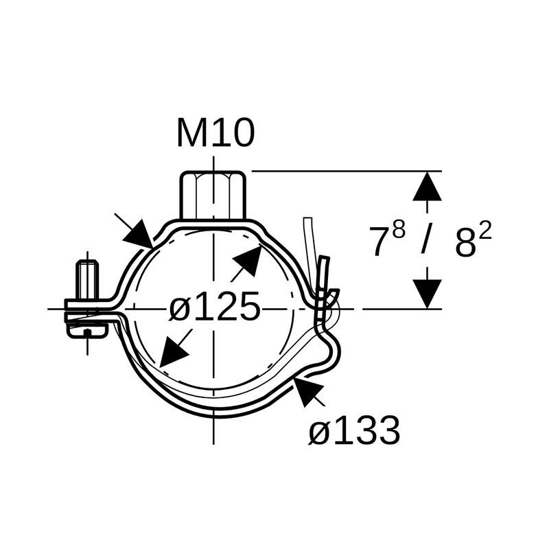 Geberit-putkikannake kierremuhvilla M10, säädettävä: di = 125 mm, di1 = 133 mm.